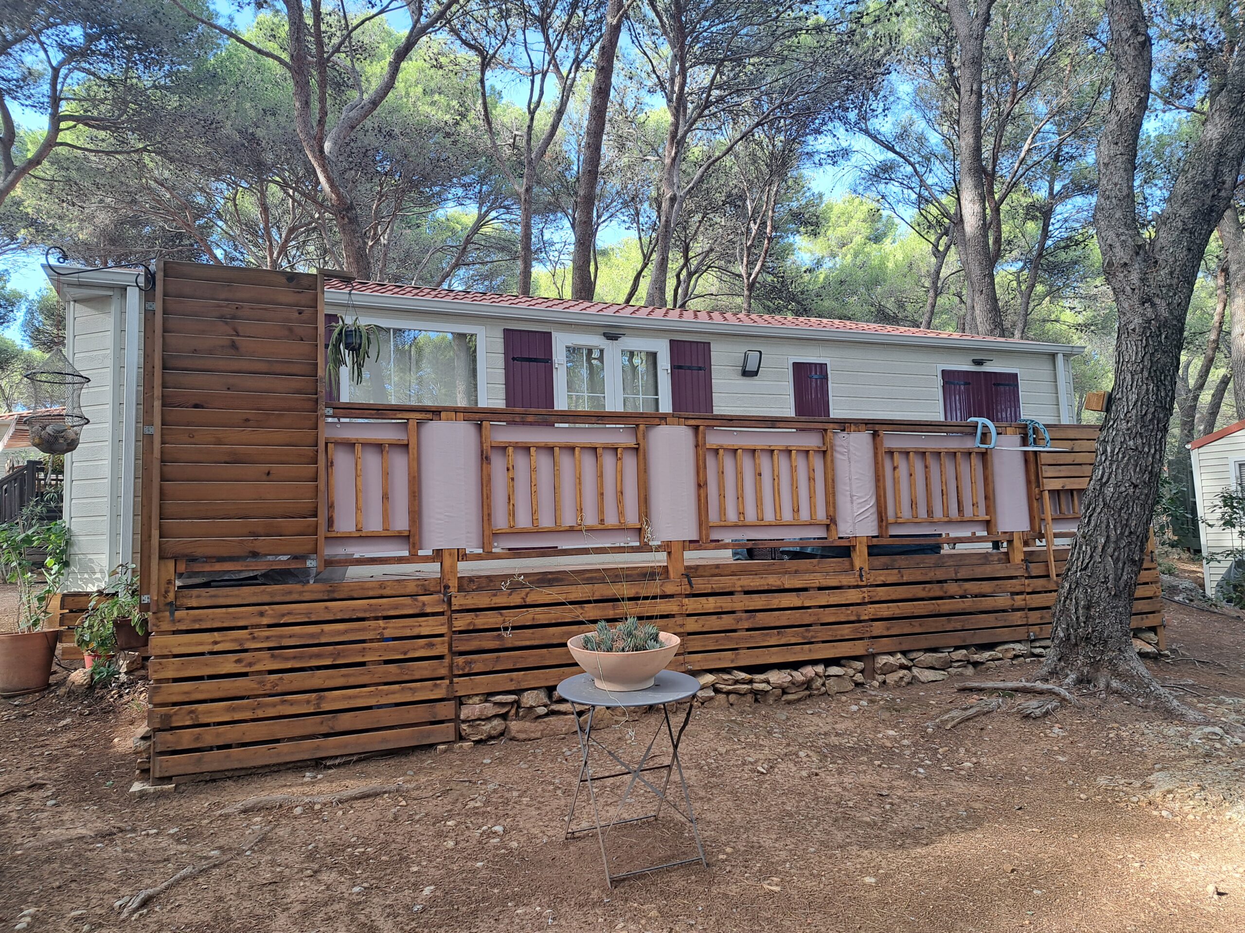 NB : toutes les résidences mobiles sont équipées de terrasse en bois avec salon de jardin et parasol.